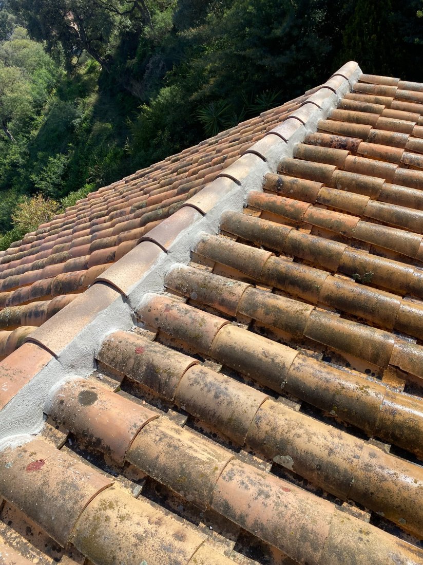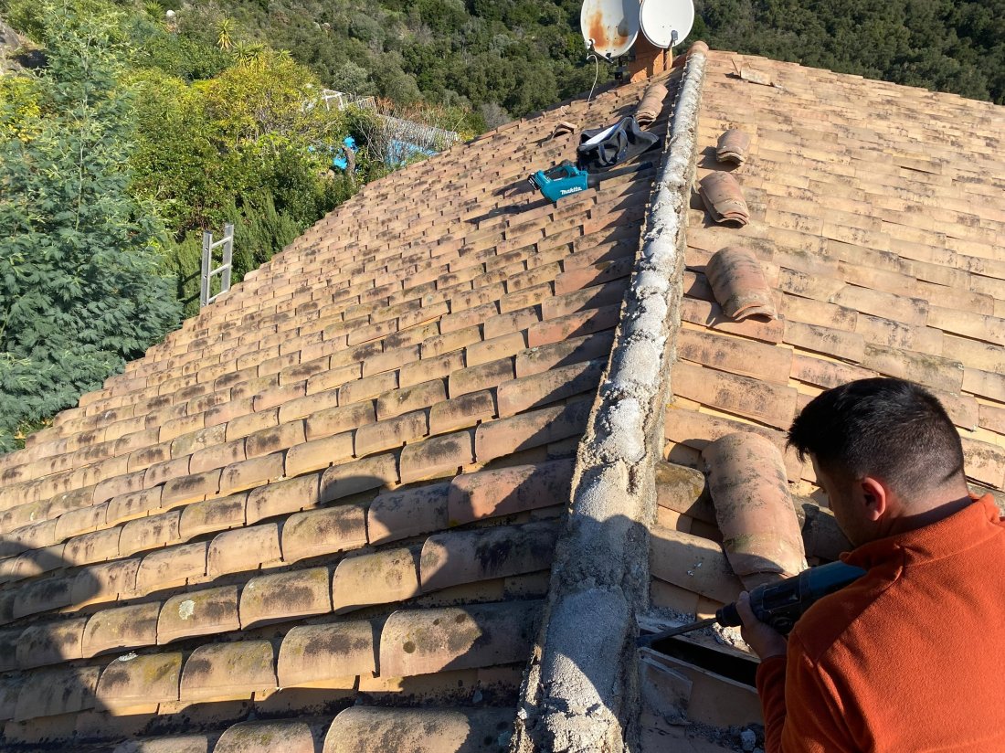 Photo illustrant la dépose d’un faîtage réalisée par FREDDY COUVERTURE à Cavalaire : intervention soignée sur toiture, démontage des tuiles faîtières pour rénovation ou remplacement, savoir-faire artisanal local.
