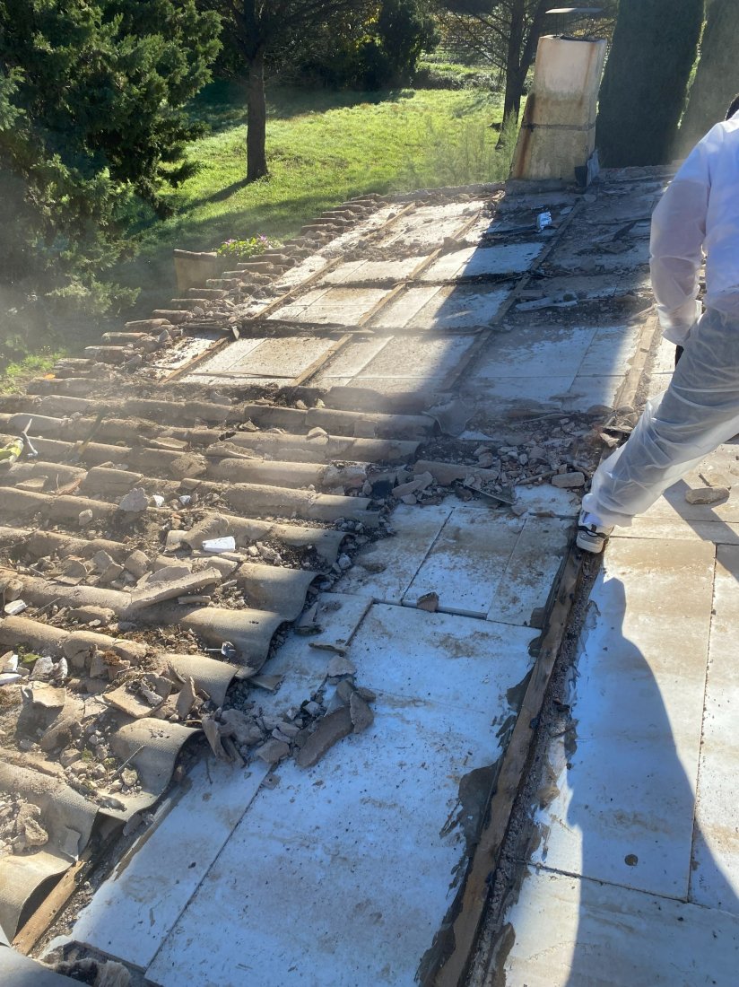 1. Dépose complète des tuiles existantes et retrait des anciennes plaques sous tuiles.