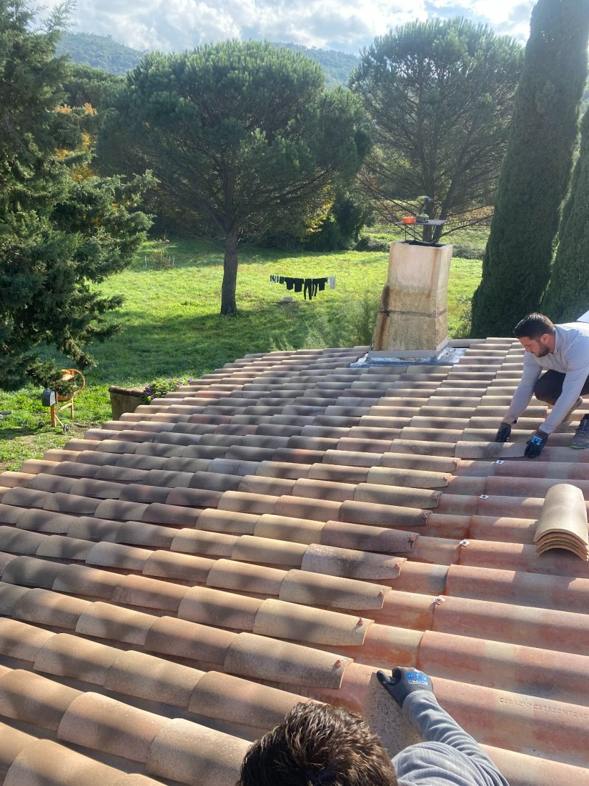 Pour ce chantier, l'objectif principal est d'assurer la pérennité et l’étanchéité de votre toiture. Nous intervenons pour déposer les anciennes tuiles ainsi que les plaques situées sous les tuiles, puis nous procédons à la pose d’un nouvel écran sous toiture. Ce travail garantit une protection optimale de la charpente contre les infiltrations d’eau, tout en améliorant l’isolation thermique et la ventilation de la maison. En finalité, les tuiles canal sont reposées avec soin, assurant à la fois l’esthétique traditionnelle et la robustesse de votre couverture.