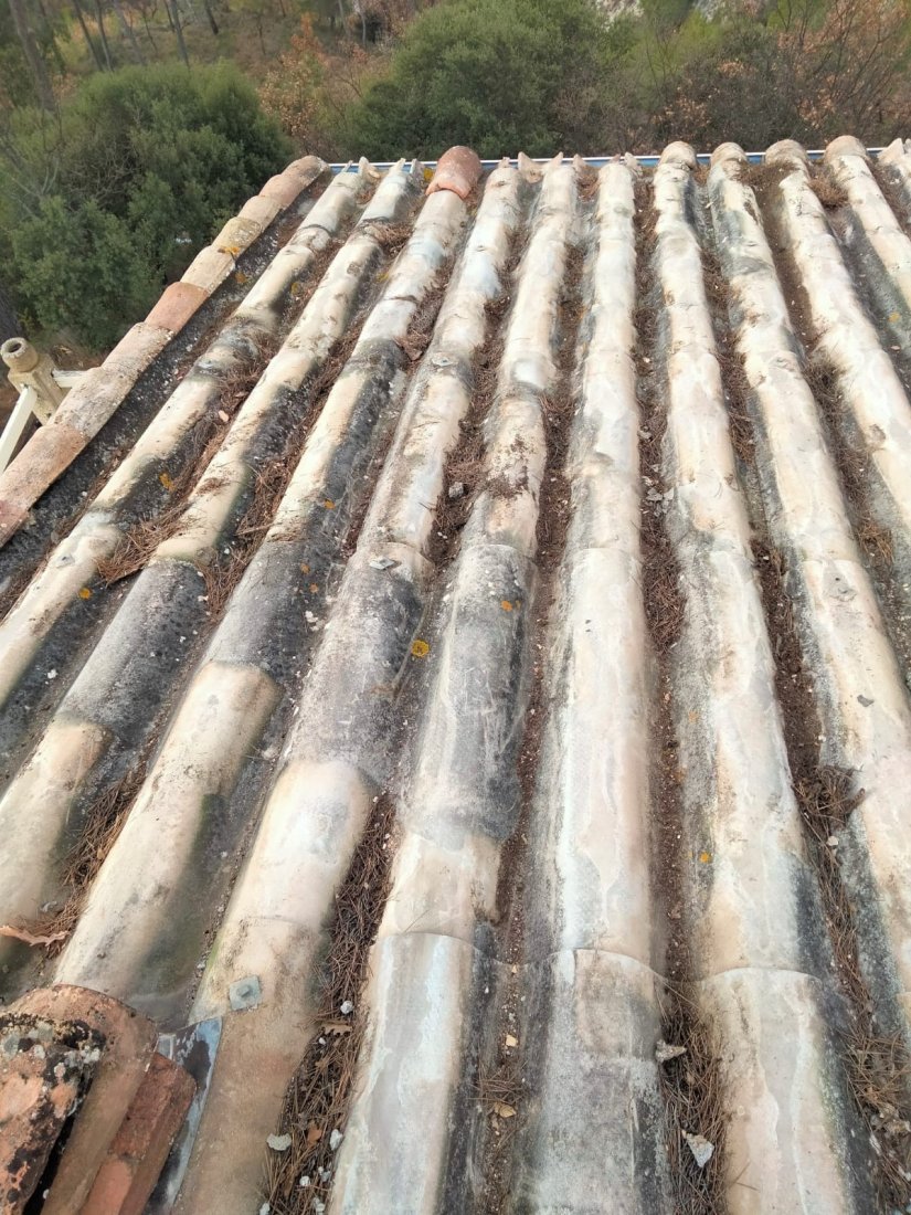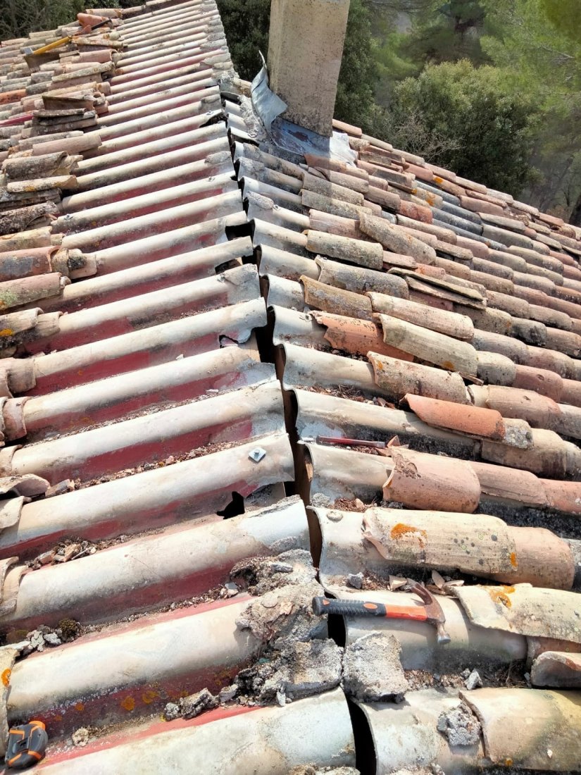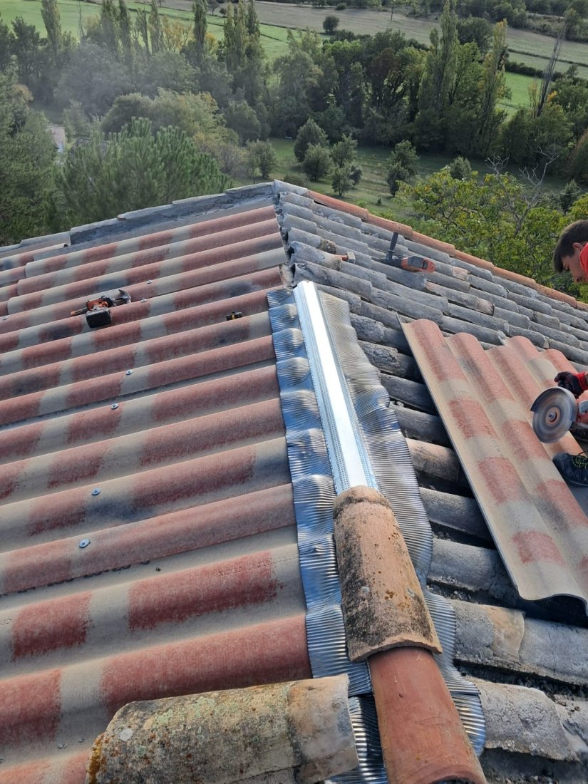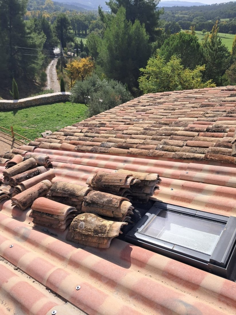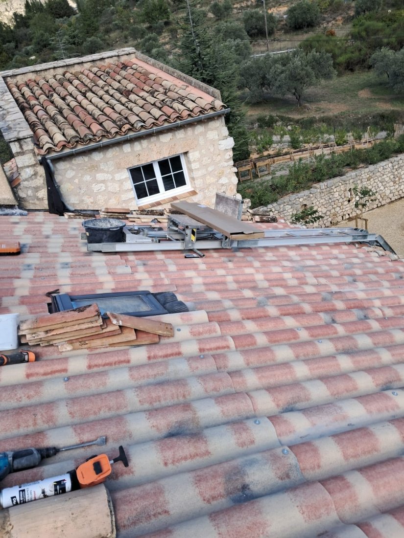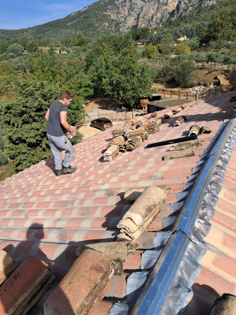 Photo d’un chantier au Muy : l’équipe FREDDY COUVERTURE procède au changement de toiture avec dépose et repose minutieuse de tuiles et plaques PST, garantissant un travail soigné et durable.